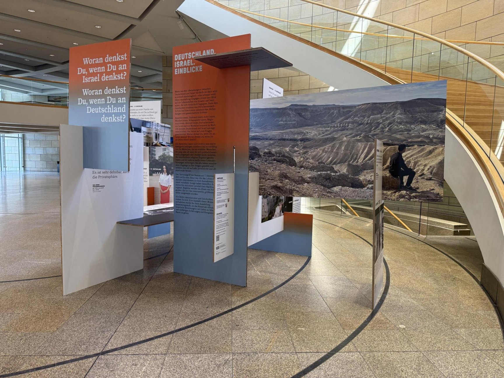 Wenn von den „Beziehungen“ zwischen Deutschland und Israel die Rede ist, dann wird es schnell staatstragend – oder schwarz-weiß. Diese Ausstellung hingegen richtet den Blick auf die Lebenswelten von Israelis und Deutschen, die sich tatsächlich begegnen. Denn ihre Geschichten erzählen von Zwischenmenschlichem und Emotionen, persönlichen Verbindungen und gemeinsamem Erleben. Künstler*innen, Diplomat*innen, Autor*innen, Musiker*innen, Schauspieler*innen, Regisseur*innen, Aktivist*innen, Journalist*innen, ein Jurist und ein Mentalist kommen zu Wort. Alle kennen Deutschland und Israel aus eigenem Erleben. Sie haben auf zwei Fragen geantwortet: Woran denkst Du, wenn Du an Israel denkst? Woran denkst Du, wenn Du an Deutschland denkst? Die Antworten sind so vielfältig wie die Menschen, die sie erzählen.